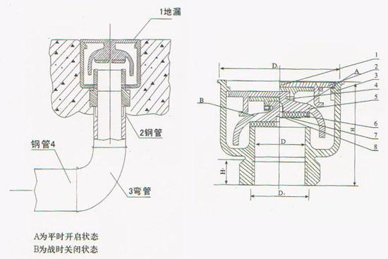 防爆地漏安裝字人防工程的排水管道處。平時地漏處于開啟狀態(tài),保證正常排水;戰(zhàn)時將地漏漏蓋下降,逆時針旋緊后封閉排水口,防止沖擊波、毒氣進入人防工程,并可防止污水倒灌。地漏漏體存水深度為30mm,能有效控制臭氣外溢。